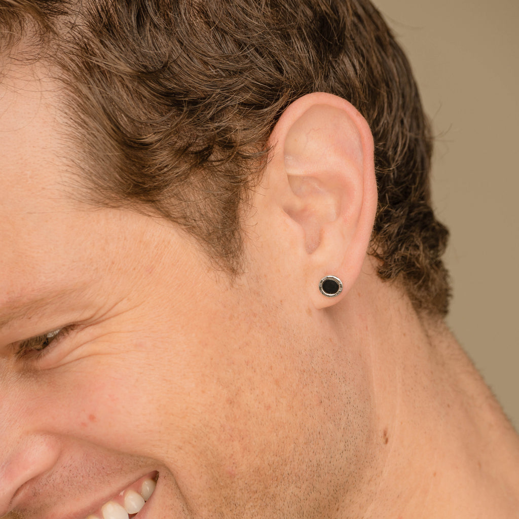 Roman Numeral Circle Black Lacquered Stud Earrings - Silver